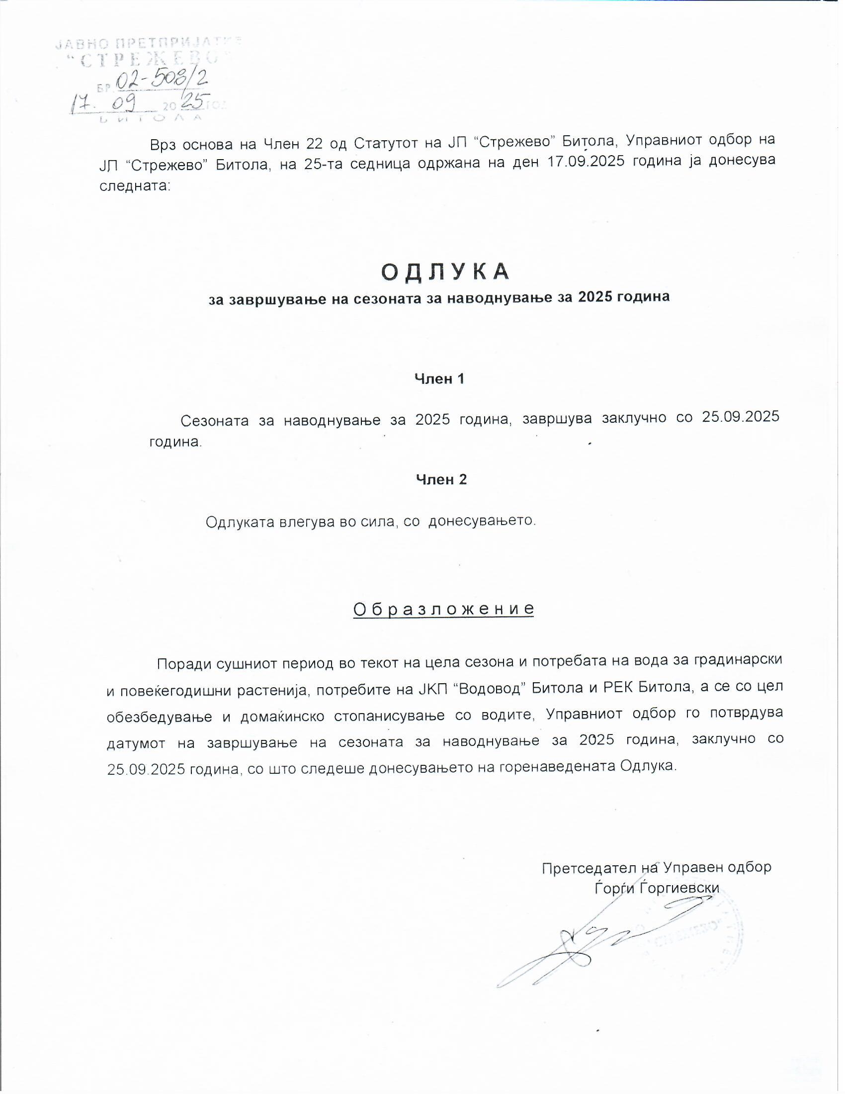 Одлука за завршување на сезоната за наводнување за 2024 година